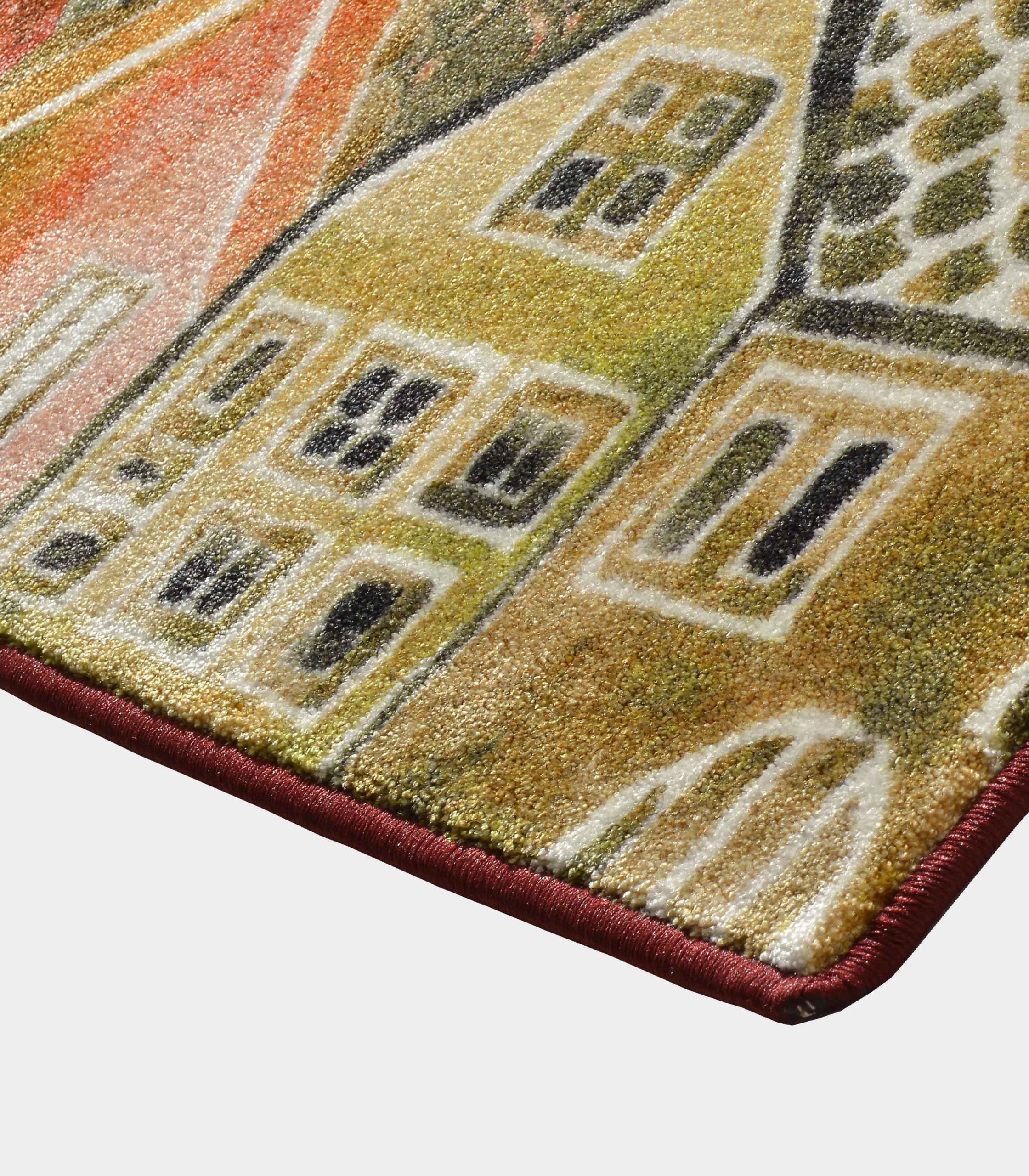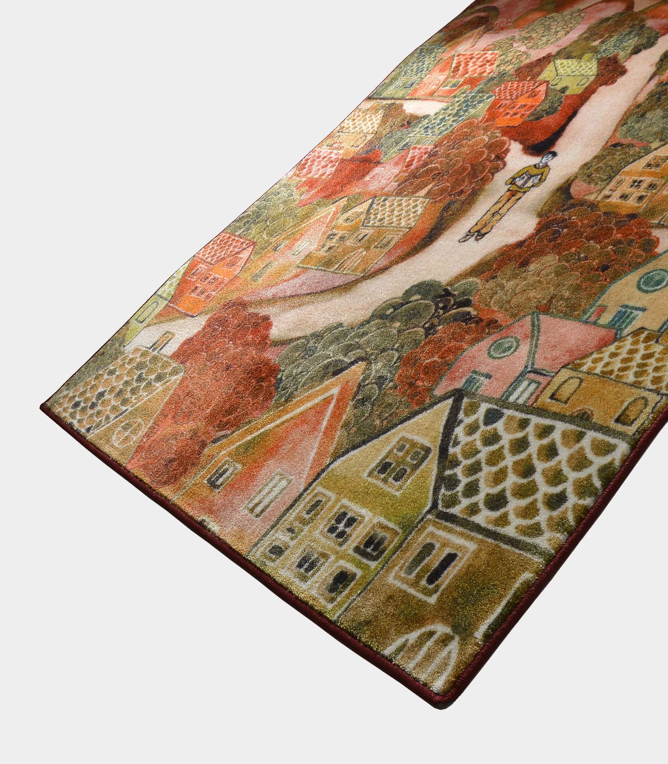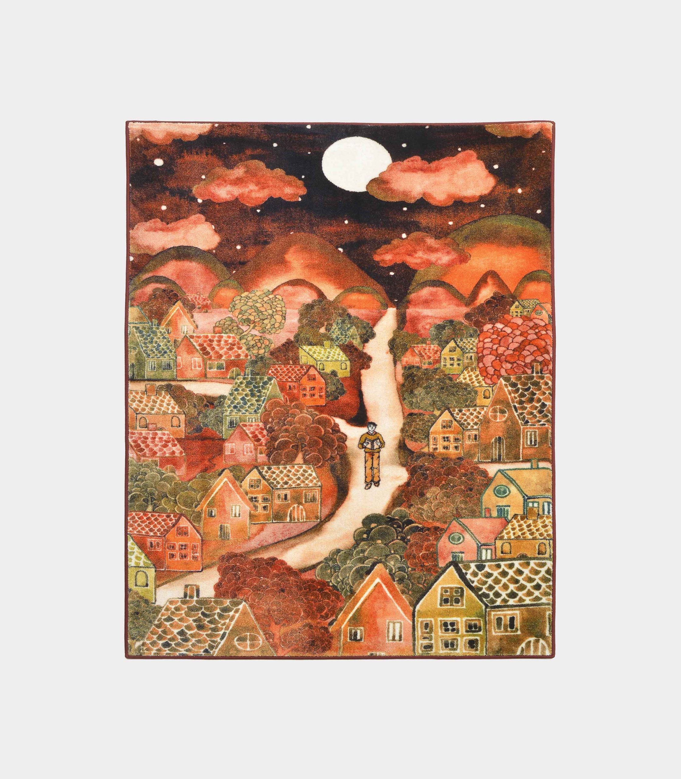 Who said the floor can’t have his paintings? This carpet has also an expressionist touch, a nocturnal landscape ranging from orange to dark red, but unlike Matisse’s works it is entirely made of fabric. As for the figures, they are all printed, so that you can walk the work of art far and wide without fraying it.